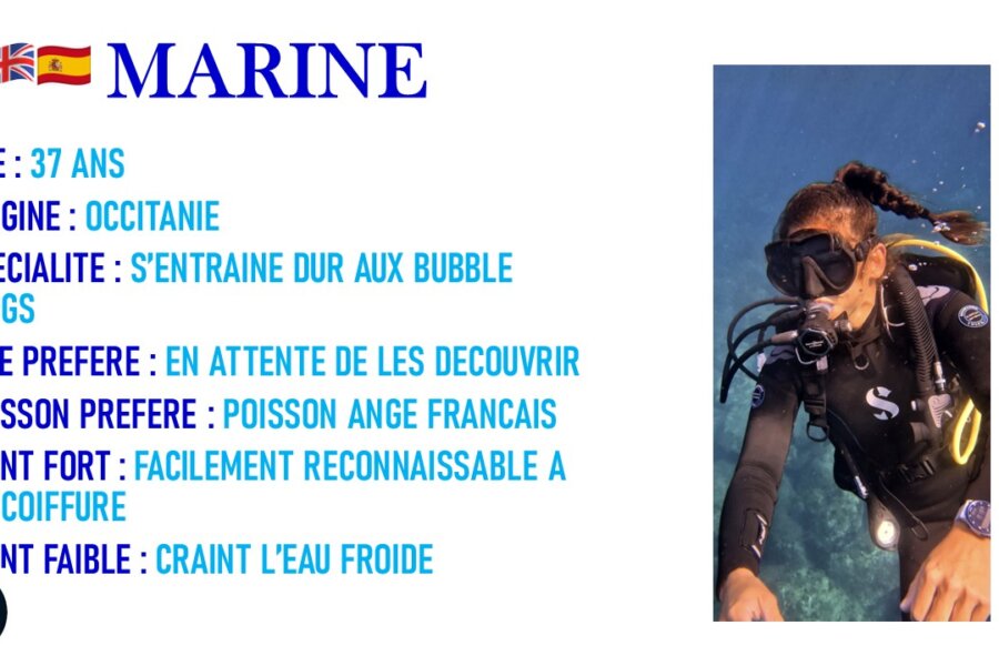 J’ai fait la plupart de mes formations au Centre Isula Plongée d’Ajaccio et n’ai pas hésité à quitter ma famille pendant 7 mois pour suivre la formation modulaire de Brevet d’Etat au Creps d’Antibes. Puis, afin de diversifier ma formation et m’ouvrir d’autres horizons, je suis devenue Instructeur PADI et Course Directeur SDI, mais je pourrais également vous initier à la plongée profonde ou au Nitrox !